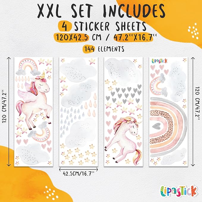 Large Rainbow Wall Decals by Lipastick - 144 pcs Rainbow Wall Stickers - Unicorn Wall Decals for Kids Bedroom Room Nursery – Kids Wall Stickers Cloud Stars Ponies - Waterproof Wall Art Décor XXL Size