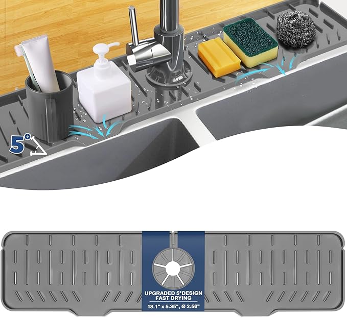 • 💪【5° UPGRADE VERSION】 Silicone sink faucet mat with upgraded 5° slope design and upgraded 0.79" (2 cm) thickness, the kitchen faucet splash guard allows captured water to flow into the sink faster, resulting in faster drying of the kitchen sink. This means never gets soggy, or not having any water spots by the sink faucet. You don't need to worry about the water staying on the sink & bathroom counter. Upgrading your kitchen sink & bathroom countertop in an effort-saving way!