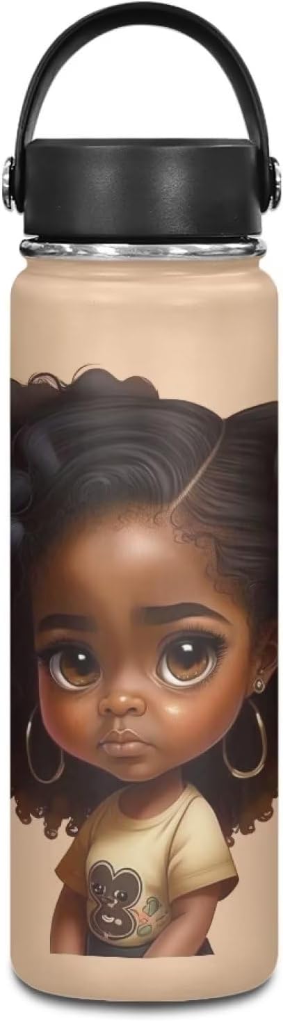 African Girl 18 oz Insulated Water Bottle with Handle Stainless Steel Sports Water Flask Cup Portable Handle Lid Hot and Cold Water Bottle Magic American Afro Travel Canteen Mug