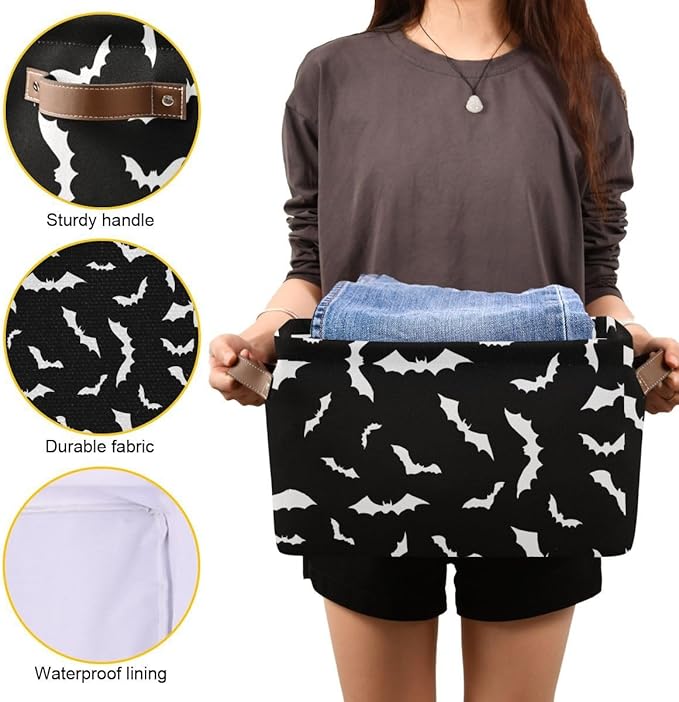 Halloween Black Bat Storage Basket Fabric Kitchen Baskets Spooky Happy Halloween Open Home Storage Bins Boxes Foldable Organizer Bag for Baby Cloth Pet Toy Book Shelf Closet Baskets 16×12×8 Inches