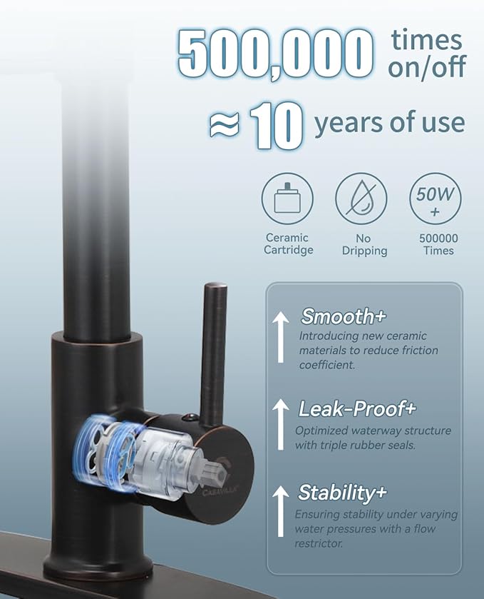 • 【EASY MAINTENANCE】Lead-free solid brass body and commercial SUS 304 stainless steel spring construction forged products. Oil Rubbed Bronze surface treatment added 18/8 Chromium/Nickel content provides a superior anti-corrosion and anti-rust finish that prevents dirt such as fingerprints or water stains from adhering to the faucet surface, making the kitchen look cleaner. Daily cleaning with a cloth or water is enough, less time cleaning and more time having fun with your family.