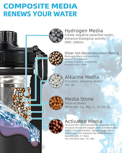 • Quick access to alkaline water: The filter water bottle design ensures that every drop of water is fully passed through the filter, bringing the pH of any water to 9.5+ in just a few minutes. You can enjoy alkaline water with minimal waiting time. It also enriched the water with hydrogen.