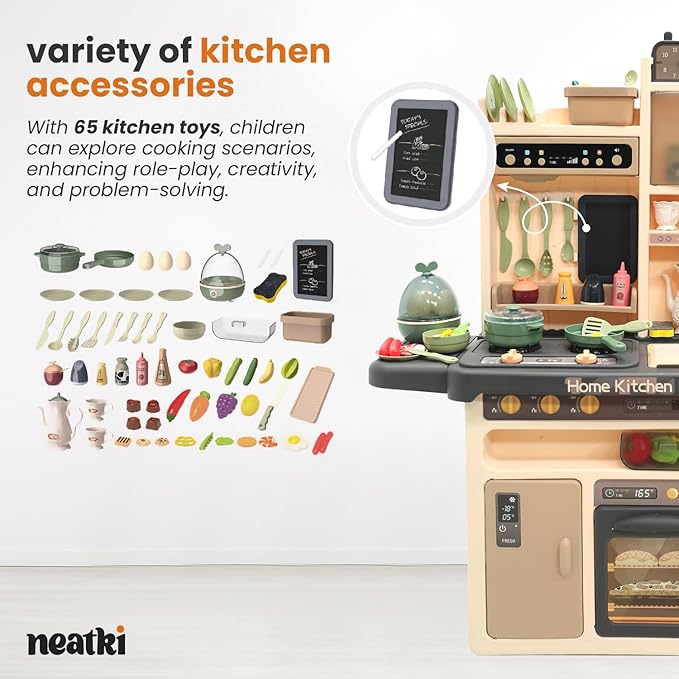 • Assorted Kitchen Accessories – With 65 pieces of assorted kitchen accessories, including utensils, pots, pans, and play food items, children have ample opportunities to explore different culinary roles, fostering creativity, social skills, and fine motor development during playtime.