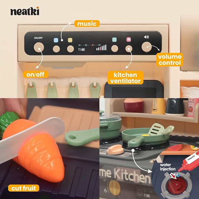 • Steaming Action – Mimicking real cooking experiences, this play kitchen set includes steaming action, adding a touch of realism to pretend cooking activities, encouraging creative storytelling and problem-solving.