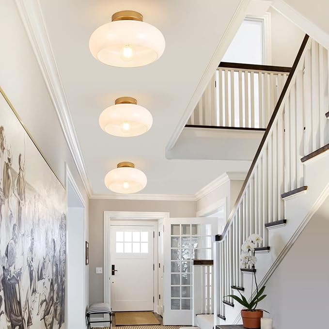 • Mid-Century Modern Design: This white semi flush mount ceiling light features a frosted glass shade and a brushed brass metal base. The open shade design makes it easier to clean and change bulbs