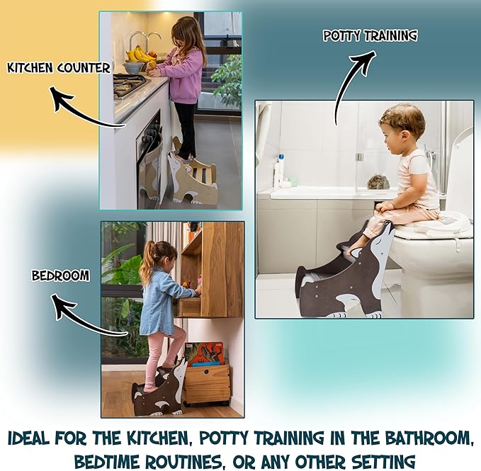 • Multiple uses♻️: Our wood step stool for kids, can be used as a kids step stools for toddlers bathroom , as a kitchen stool for toddlers or anywhere your little one might need a little help!