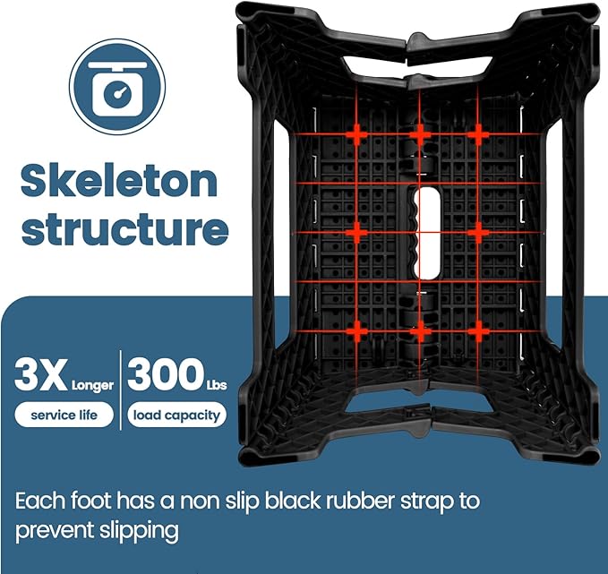 • Sustained Material: To ensure the longevity of our folding stool, it's constructed with Sustained plastic material that can hold up to 300 pounds. This ensures that the step stool will remain a reliable companion for years to come.
