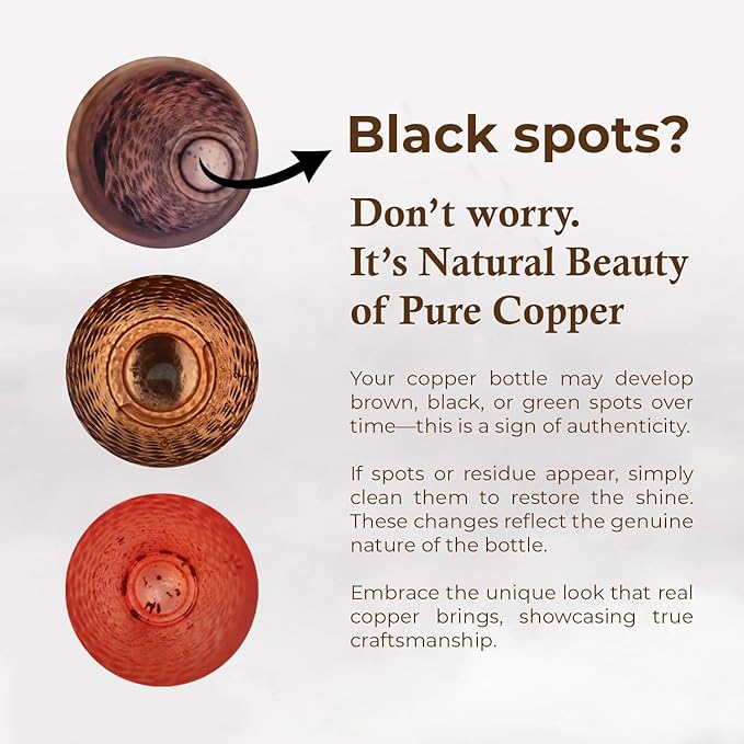 • CARE AND MAINTENANCE: Made from 100% pure copper, this bottle may develop a natural patina or black residue over time due to natural oxidation. To restore its shine from inside, clean with lemon, salt, and vinegar till all dirt cleaned out. This natural process is normal and safe, enhancing the bottle's authenticity