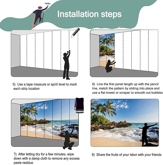 • Mural wallpaper size: 140 "W x 102 "H, divided into 7 sections, each section is labeled with a number underneath, there is no need to overlap the pattern when installing, just install according to the number labeled underneath the panel