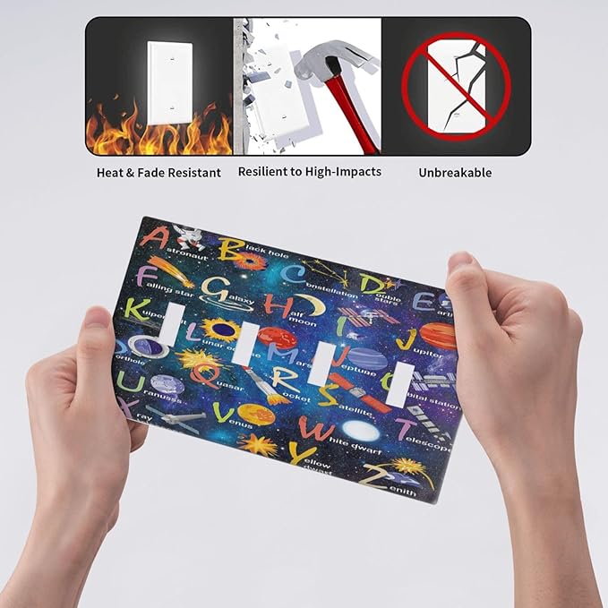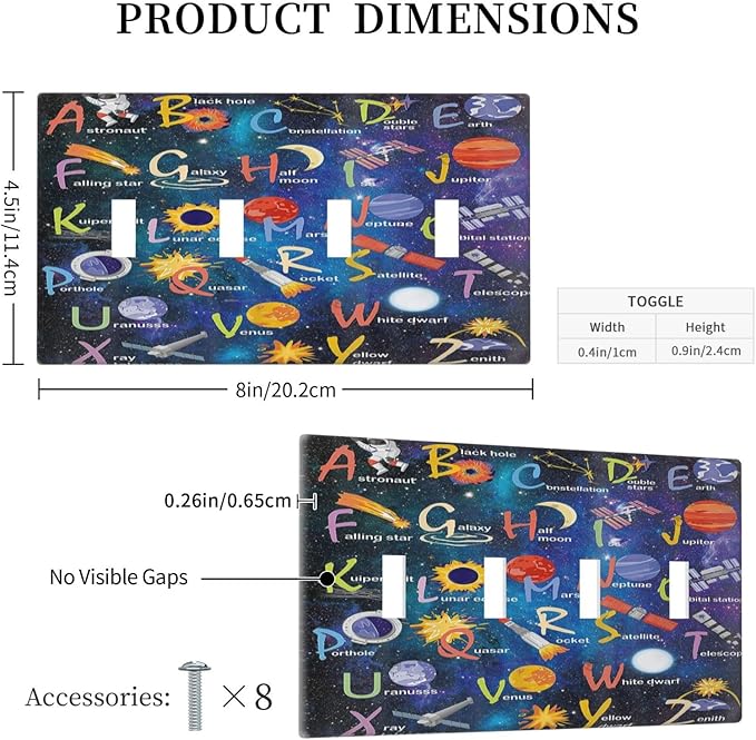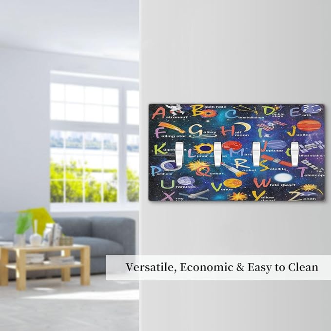ABC Outer Space Quad Toggle Light Switch Cover Decorative Alphabet Galaxy Boys Educational 4 Gang Wall Plate Electrical Faceplate Switchplate for Kidroom Nursery Boyroom Living Room Decor