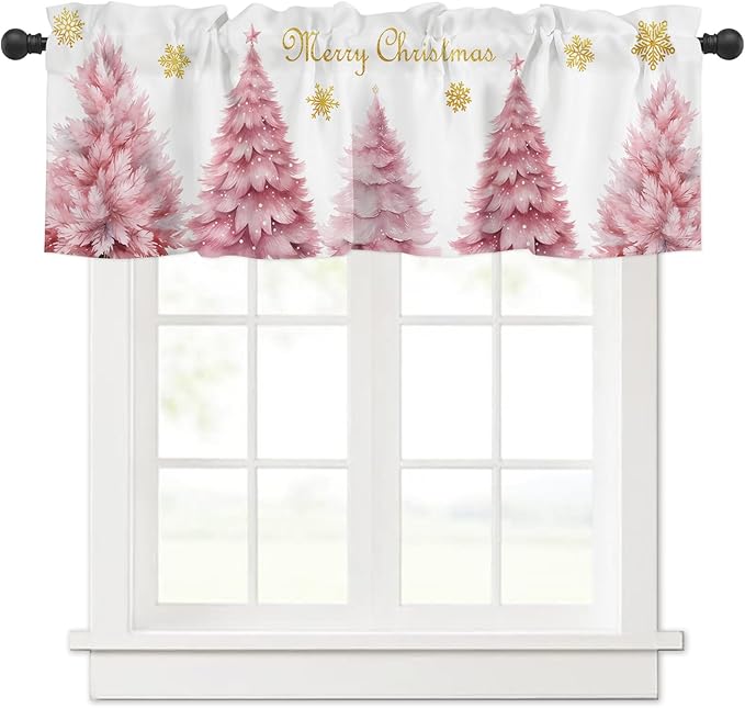 Pink Xmas Tree Window Valance for Bedroom Living Room, Gold Snowflake Christmas Window Curtain for Kitchen Bathroom, Pink Christmas Window Valance Rod Pocket Window Treatment, 54" W x 18" L