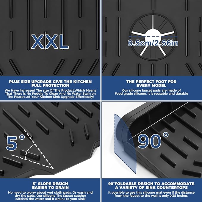 • 💪【5° UPGRADE VERSION】 Silicone sink faucet mat with upgraded 5° slope design and upgraded 0.79" (2 cm) thickness, the kitchen faucet splash guard allows captured water to flow into the sink faster, resulting in faster drying of the kitchen sink. This means never gets soggy, or not having any water spots by the sink faucet. You don't need to worry about the water staying on the sink & bathroom counter. Upgrading your kitchen sink & bathroom countertop in an effort-saving way!