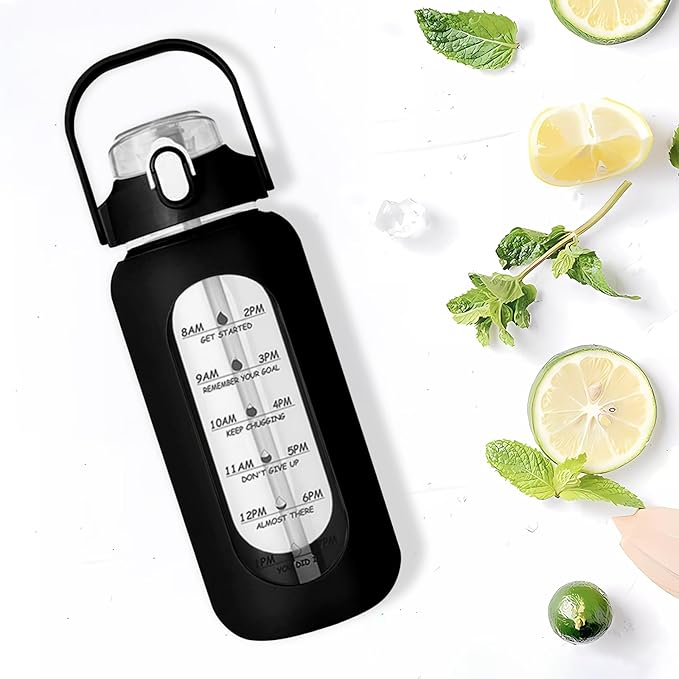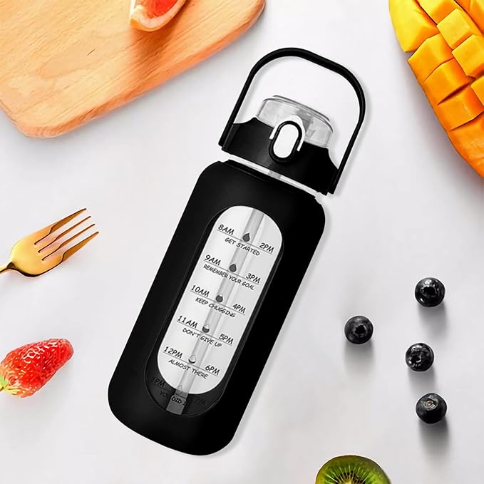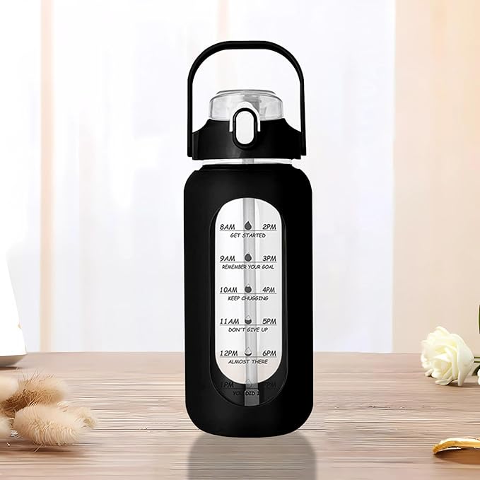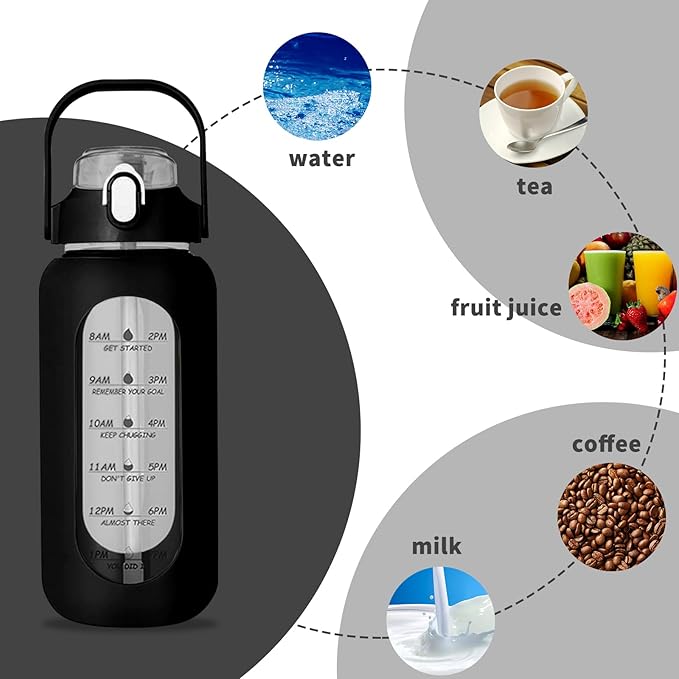 64oz Glass Water Bottle with Straw - Half Gallon Large Motivational Water Bottle with Silicone Sleeve Time Marker, Ideal for Gym, Sports, Workouts, Daily