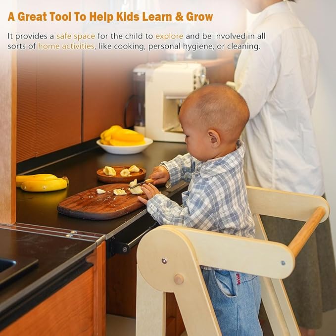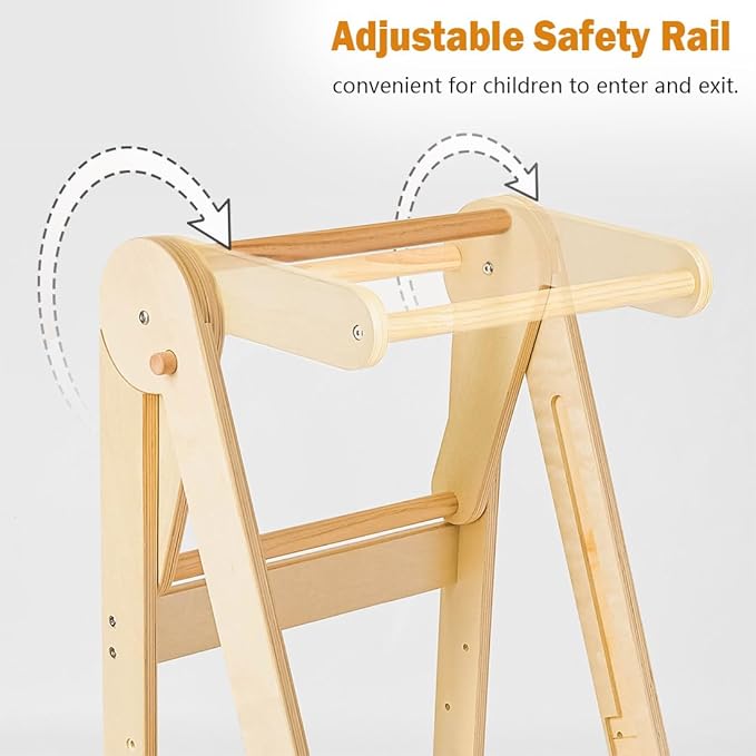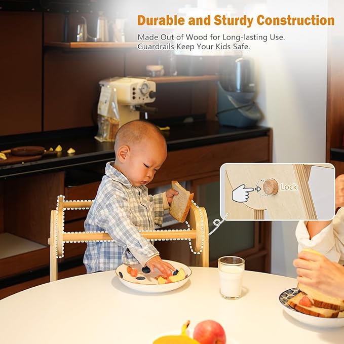 • Safe and Stable Structure: Toddler Stool are composed of four wooden legs, safety pedals, safety rails with lock, unique slotted design. Four wooden legs increase stability so the learning tower won't easily tip back. Birch plywood can bear the weight of an adult.