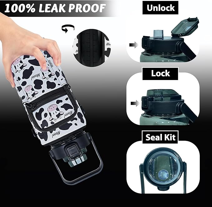 • [64 oz Water Bottle with Straw]: Our 64-ounce hydration bottle is designed to motivate and inspire you to reach your daily water intake goals. It is equipped with a food-grade sealing ring and a one-handed safety lock to prevent any leaks. Press the button to use the straw and enjoy quick water flow without spilling on-the-go. The water jug has a wide mouth design that allows easy addition of fruit and ice cubes, making cleaning effortless.