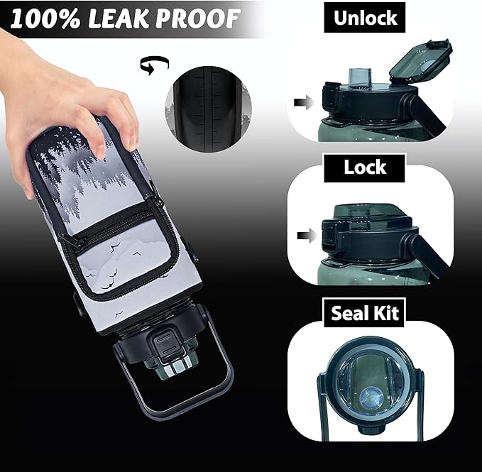 • [64 oz Water Bottle with Straw]: Our 64-ounce hydration bottle is designed to motivate and inspire you to reach your daily water intake goals. It is equipped with a food-grade sealing ring and a one-handed safety lock to prevent any leaks. Press the button to use the straw and enjoy quick water flow without spilling on-the-go. The water jug has a wide mouth design that allows easy addition of fruit and ice cubes, making cleaning effortless.