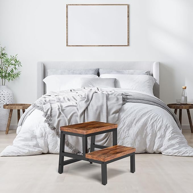Wood Bed Side Step Stool for High Beds Adult - 2 Step Wooden Step Stools for Adults for Bedside, Heavy Duty Stepping Stool for Bed/Kitchen/Bedroom, Holds Up to 500 lbs Capacity, Brown
