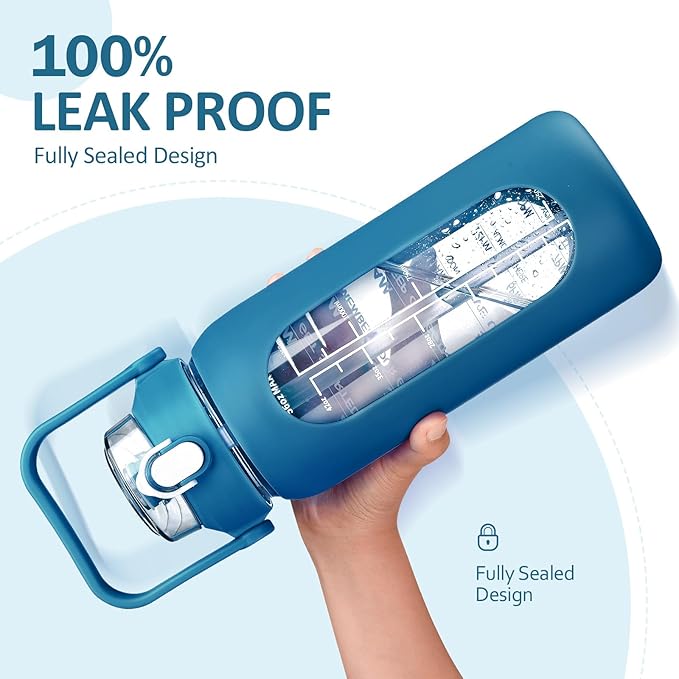 • ❤More Function- Our glass water bottle with stylish silicone sleeve which provides more grip and prevents the water bottle from slipping out. -This large motivational water bottle has a wide mouth, not only easy to hold ice cubes and fruit but also very easy to clean, you can use our complimentary cup brush to clean your water glass. -Handle on the lid for easy portability.