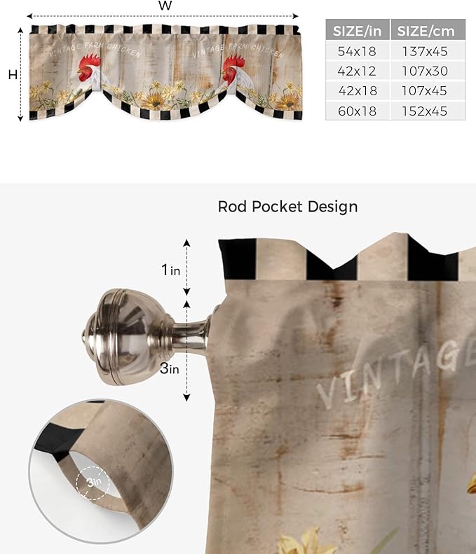 • Rod Pocket Short Kitchen Curtains: With Built-In 4" Rod Pocket,It Fits Up To 2" Diameter Basic Or Decorative Curtain Rods Of Blackout Window Valances/ Valance Window Treatments Tiers/Tie-Up Shades