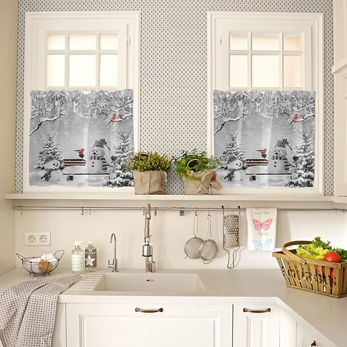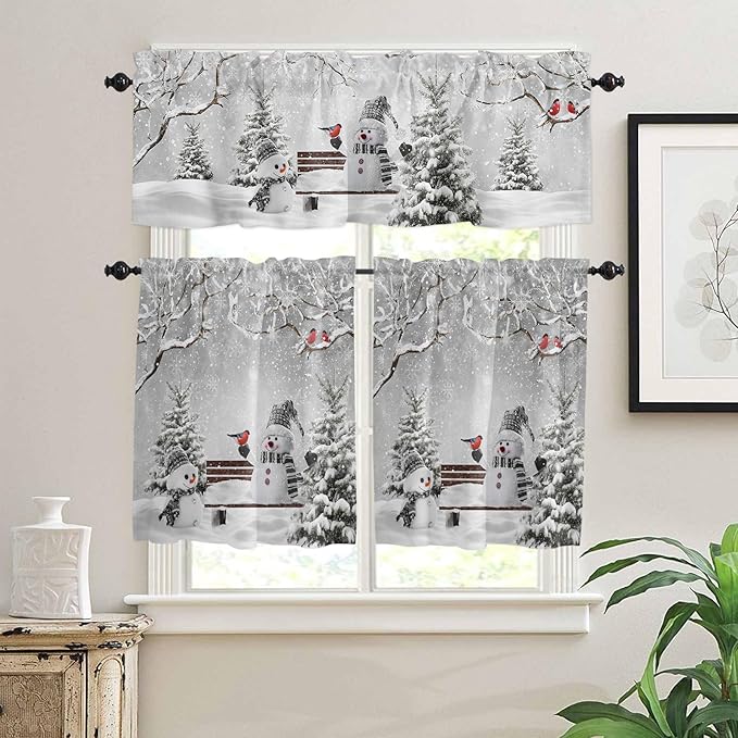 Winter Christmas Kitchen Curtains and Valances Set, Cute Snowman Cardinals Windows Treatments Tiers Half/Short Curtains for Small Windows Cafe /Living Room/ Bedroom 54x24 in GreySnowy Pine Forest