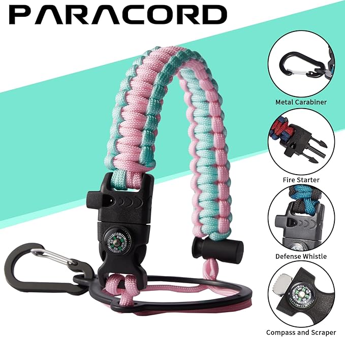 • UNIQUE PARACORD—Perfect Accessories: bright color paracord matches the flask water bottles to give you a youthful vibe while adding a personal style. It comes with a compass, safety loop, metal carabiner, flint, igniter, and whistle to become your survival tool for your wild adventures