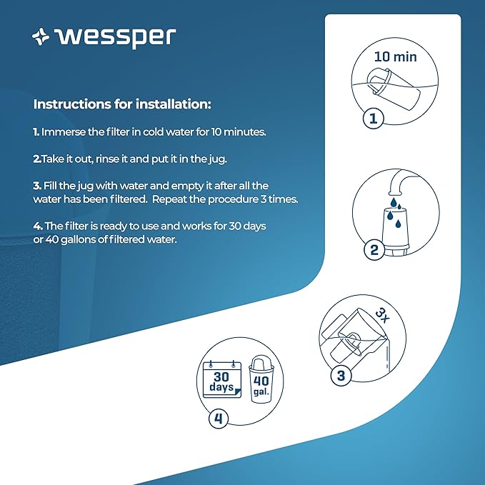 • PREMIUM QUALITY: Our products are manufactured in Europe using high quality, food grade materials which guarantee an efficient filtration performance, high flow rate and safety. All Wessper pitcher water filters are 100% BPA-Free providing you with a peace of mind about the safety of you and your loved ones. Each filter has a long lifespan of up to 40 gallons (Depending on your local water conditions) making it a great choice filter replacement