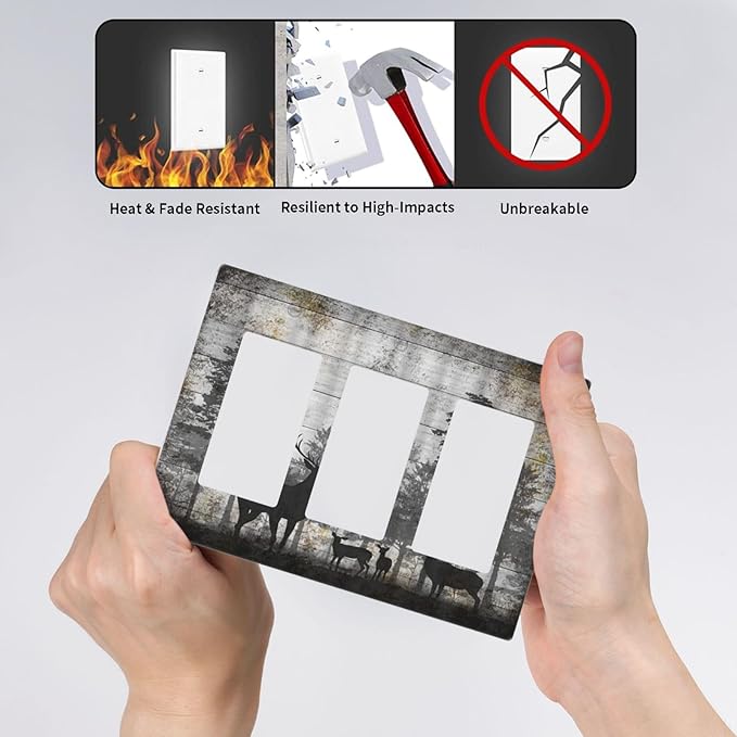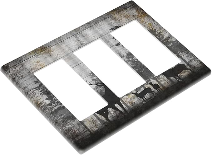 Rustic Deer Forest Vintage Wood Board 3 Gang Rocker Boho Light Switch Covers Decorative Country Unique Triple Outlet Wall Plate Cover Faceplate Decorative Switchplate GFCI for Farmhouse
