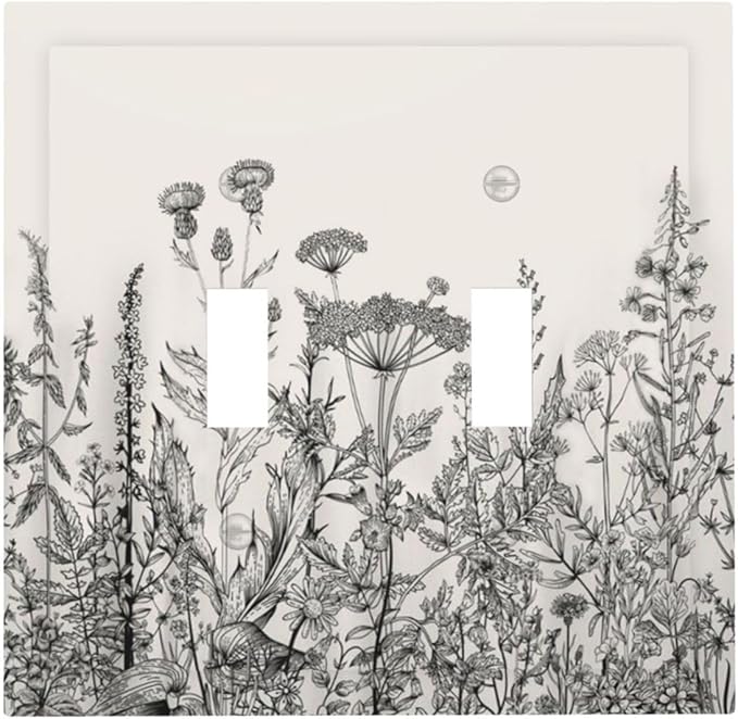 Vintage Grey Floral Herbs Wild Flowers Botanical Double Toggle Boho Light Switch Covers Decorative Country Unique 2 Gang Wall Plate Dual Electrical Faceplate Switchplate for Living Room