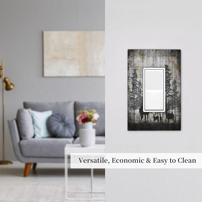 Rustic Deer Forest Vintage Wood Board 1 Gang Rocker Boho Light Switch Covers Decorative Country Unique Single Decora Outlet Wall Plate Faceplate Switchplate GFCI for Farmhouse Bedroom