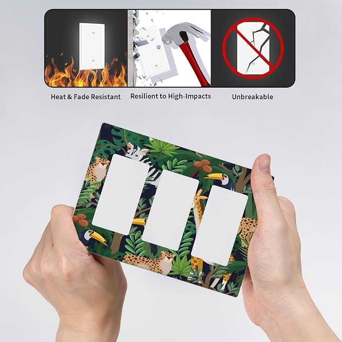 Cartoon Animal Zebra Leopard Giraffe Bird Leaf 3 Gang Rocker Nursery Light Switch Covers Decorative Triple Outlet Wall Plate Cover Faceplate Decorative Switchplate GFCI for Kidroom Decor