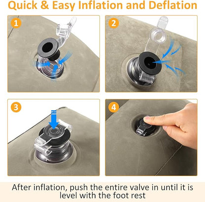 • Double Cap Valve - Our inflatable foot rest pillow with 2-in-1 double valve,the upper black air valve is a one-way air inlet for inflating or replenishing gas.bottom transparent air valve can be quickly inflated and deflated,when you are done blowing it up, push clear cover on and push whole valve in so that it is flush with the side of the travel foot pillow,the airplane footrest takes away the hassle of bringing a pump and making noise in flight.
