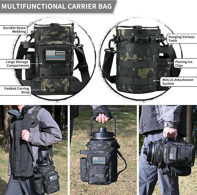 • 【Suitable For Traveling & Sport】: Wherever you go, you can bring a water jug with you. If you or your loved one is an outdoor worker, such as movers, truck drivers or couriers, this bottle is a lifesaver in the summer heat. It's also great for workout, hiking, camping, student football training, baseball training or backpacking. Our water bottle with tactical carring bag is a great gift idea!