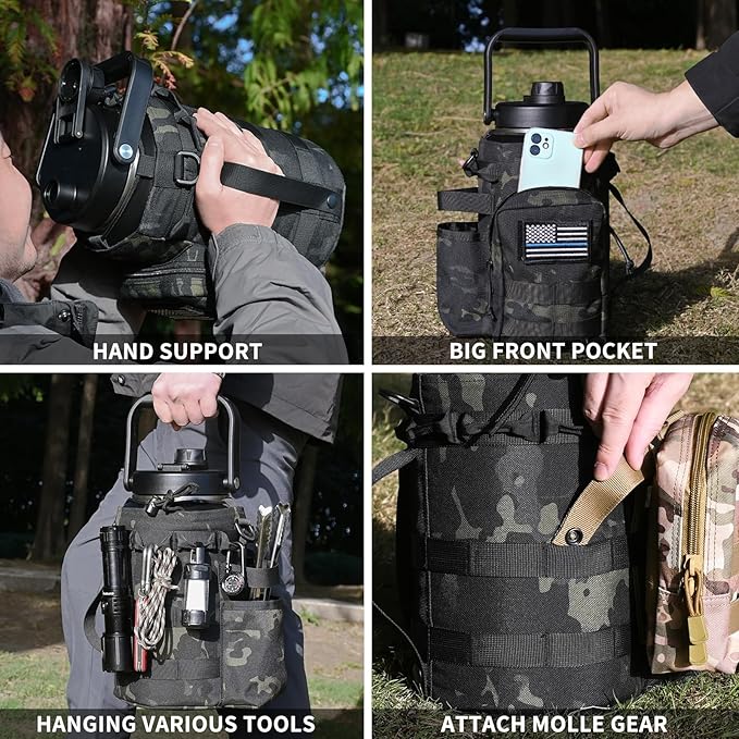 • 【Tactical Bag For Easy Carring】:Our water bottle holder is made of double-layer polyester and insulating Oxford cloth, which provides protection for the water jug. The water bottle bag also adds warmth, making it more effective in maintaining cold or hot. It has a detachable shoulder strap for carrying and a hand support strap on the side for easy pouring of water. Water bottle carrier bag has MOLLE webbing attachments and a large storage compartments for your phone, keys, wallet and more.