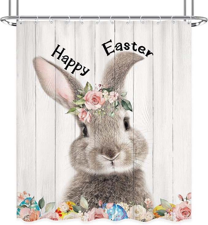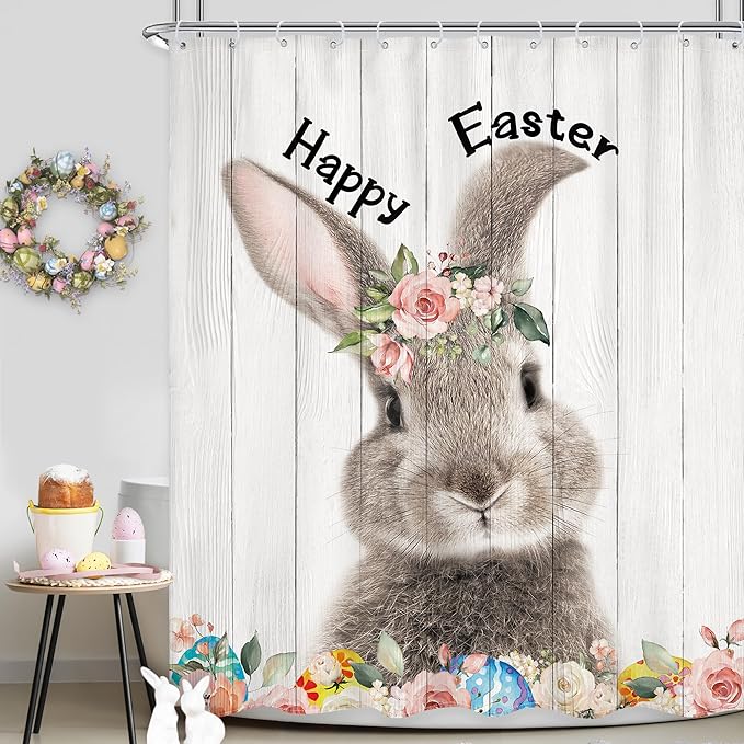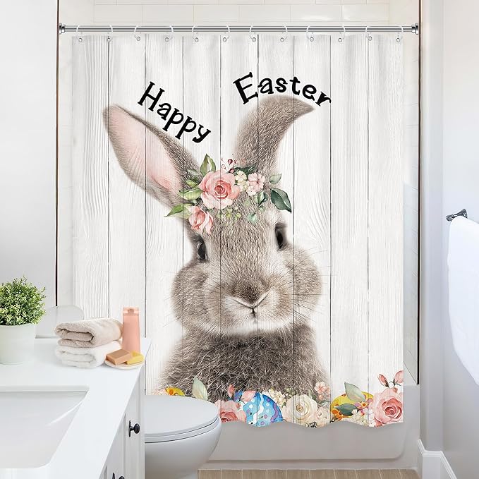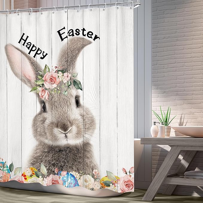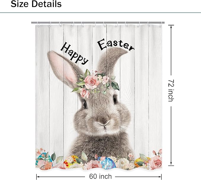 Happy Easter Rabbit Bunny Shower Curtain 60Wx72L Inch Rustic Cute Animal Spring Kids Wood Board Flower Floral Shower Curtain Bathroom Set Country Bath Curtain Bathtub Accessories Home Decor