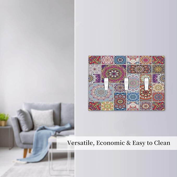 Morocco Talavera Mexican Tiles Printed Colroful Mandala 3 Gang Light Switch Covers Triple Toggle Wall Plate Decorative Switchplate Electrical Faceplate for Kitchen Bathroom Bedroom Decor