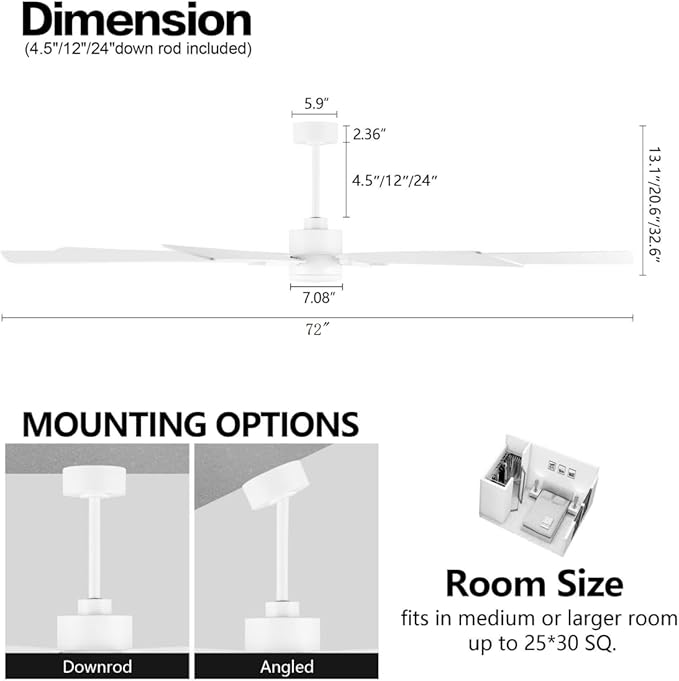 • Easy to Install: The 72" blade span makes this DC ceiling fan perfect for spaces like living rooms, bedrooms, kitchen, office or warehouse, adaptible for ceilings tilting within 15°. 3 Down rods (4.5"/12"/24"long) are included to match different ceiling heights