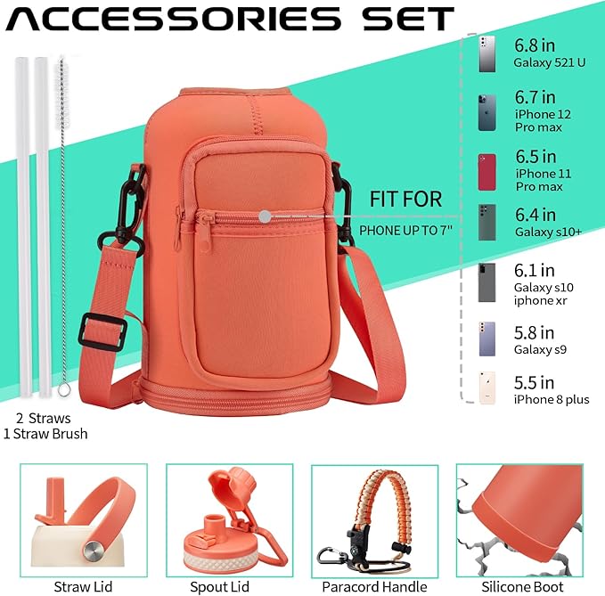 • PROTECTIVE BOOTS & STORAGE SLEEVE: Upgraded silicone boots prevent shattering and cracking when stainless steel water bottle accidental dropped. And storage carrying pouch with removable shoulder strap for convenient hands free carrying! The safe zippered pocket design to stores all your stuff, holds your cards & phone & key