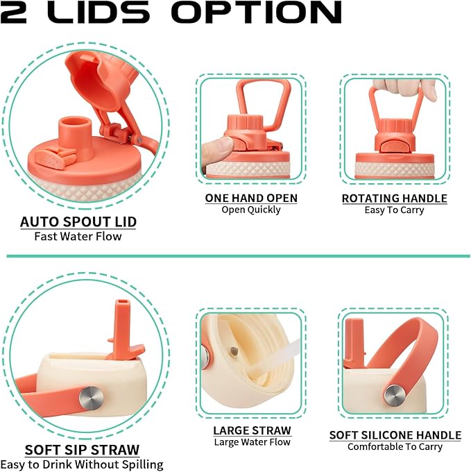 • 2 LID OPTIONS (Auto-spout & Straw): two different lids are complete LEAK PROOF & design for easy drink. The pops-up lid for easy drinking and seals shut for no leaks when you're on the go. The straw lid makes it easy to enjoy spill-proof sips, and package come with a alternative straw & a straw brush for easy cleaning