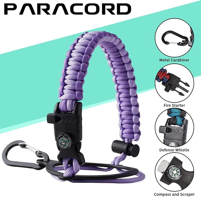• UNIQUE PARACORD—Perfect Accessories: bright color paracord matches the flask water bottles to give you a youthful vibe while adding a personal style. It comes with a compass, safety loop, metal carabiner, flint, igniter, and whistle to become your survival tool for your wild adventures