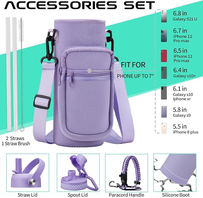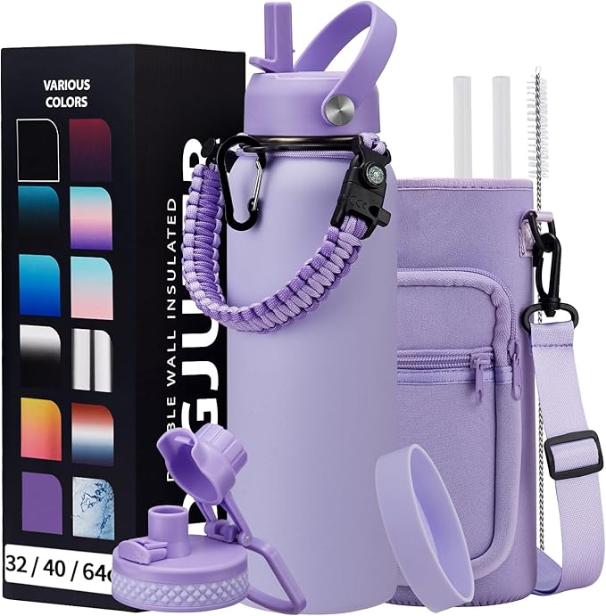 • COMBO—Super Deal: Buy 40 oz insulated water bottle and get 9 accessories (2 x lids, 1 x survival paracord, 1 x carrying pouch, 1 x shoulder strap, 1 x protective cup mat, 2 x straws, 1 x straw brush). WITH A LIFETIME GUARANTEE, these metal water bottles are the perfect gift for use at home, work, school, road trips, hiking, sporting events, or just hanging out