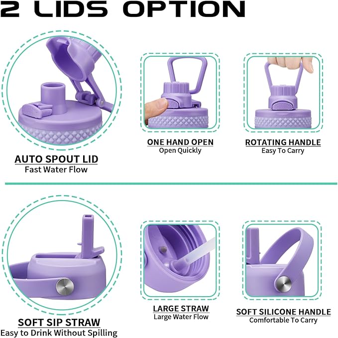 • 2 LIDS—100% Leak Proof: the auto spout cap & straw lid provide your different drinking experience. The ONE-HAND operation pop-up spout lid for convenient enjoy your fast water flow. The SPILL-PROOF straw lid with high flow rate & BPA free. Both 2 lids design with a sturdy handle, making the thermal water bottle more convenient to carry