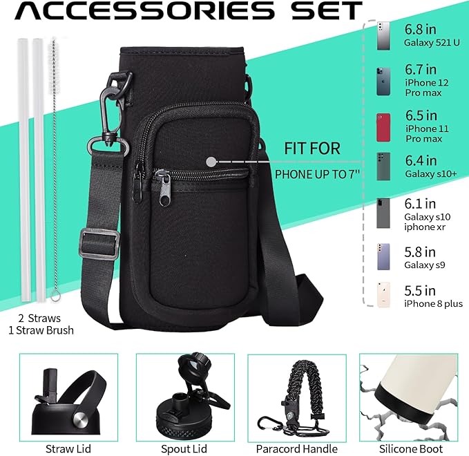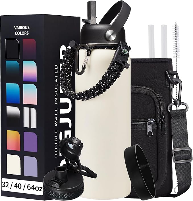 • COMBO—Super Deal: Buy 40oz insulated water bottles and get 9 accessories (2 x lids, 1 x survival paracord, 1 x carrying pouch, 1 x shoulder strap, 1 x protective cup mat, 2 x straws, 1 x straw brush). WITH A LIFETIME GUARANTEE, these metal water bottles are the perfect gift for use at home, work, school, road trips, hiking, sporting events, or just hanging out