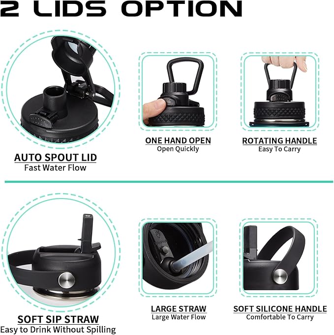 • 2 LIDS—100% Leak Proof: the auto spout cap & straw lid provide your different drinking experience. The ONE-HAND operation pop-up spout lid for convenient enjoy your fast water flow. The SPILL-PROOF straw lid with high flow rate & BPA free. Both 2 lids design with a sturdy handle, making the thermo water bottle more convenient to carry