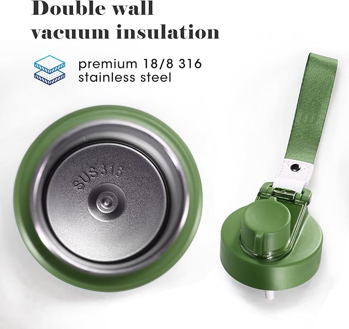 • 【Upgraded material - 316 stainless steel】316 stainless steel is further upgraded on the basis of 18/8 (304) stainless steel (controlling the proportion of impurities, adding molybdenum), corrosion prevention, acid and alkali resistance, high temperature resistance is stronger than 18/8 (304), therefore: all kinds of strong acid and alkali drinks (cola, coffee), this stainless steel water bottle can withstand. 316 stainless steel can better adapt to the environment where the temperature is too high or low, and it will not affect its corrosion resistance. Therefore: it is durable and will never leave a metallic taste or rust.