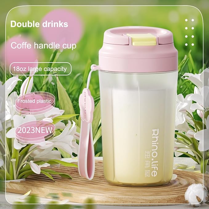 RhinoLife Premium Quality Motivational Pink Small Tiny Water Bottle with Double Drink Straw Lid, Shaker Gym Sports, BPA Free Tritan Plastic 18OZ (Fluorite Pink)
