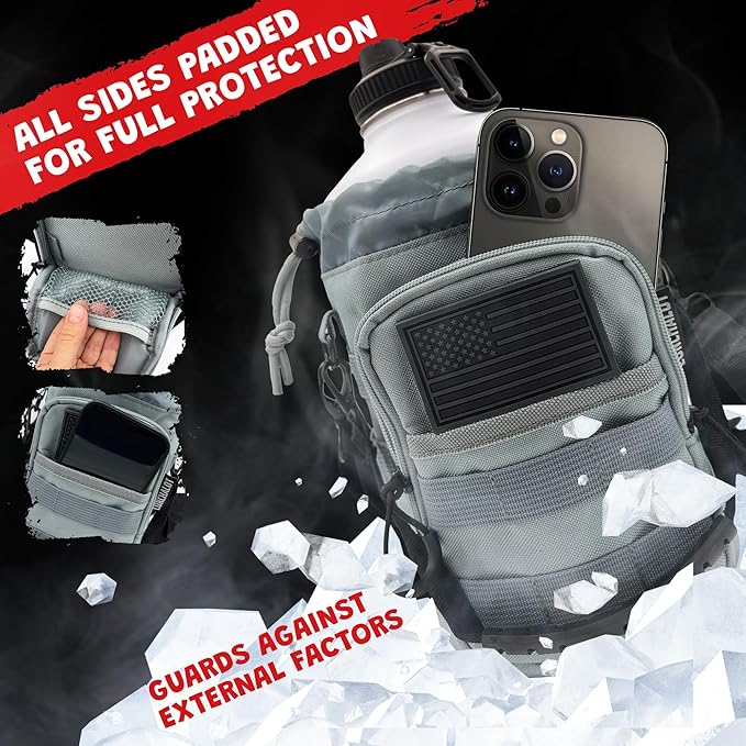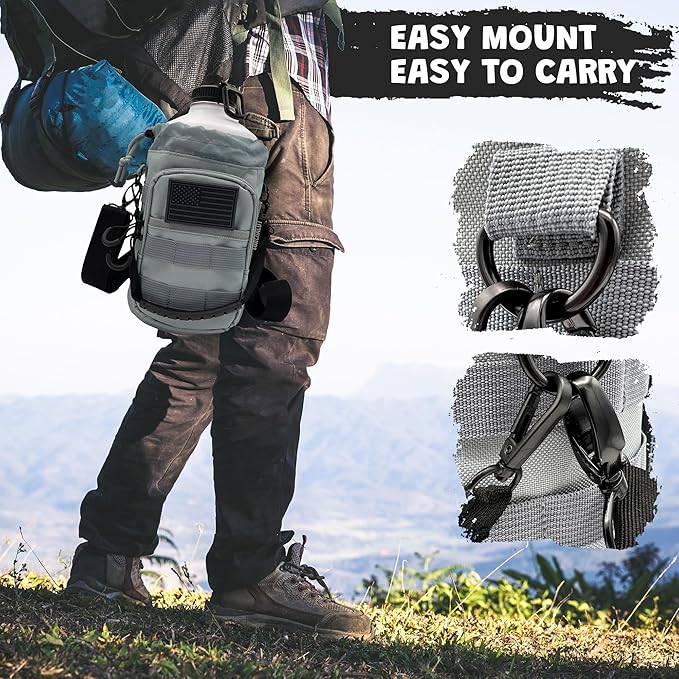 • TACTICAL BAG FOR EASY CARRYING: Bottle holder includes removable shoulder strap and removable rubberized handle; Water resistant dustproof bag has MOLLE webbing attachments and a big pocket for a phone, hidden mesh pocket for money, cards, and keys