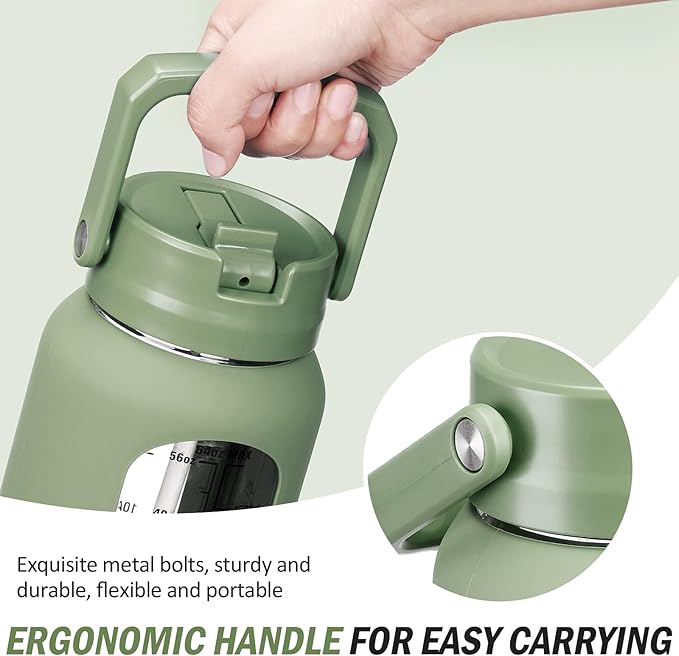 • ADVANCED HANDLE - NOLOGLAZIC half gallon water bottle features a lightweight yet durable plastic handle with a sturdy metal bolt connection, ensuring robust weight-bearing capabilities. The upgraded ergonomic design aligns with natural gripping habits, providing a comfortable hold with anti-slip and anti-sweat features. Say goodbye to ordinary handles and embrace a more powerful and thoughtful design, delivering outstanding quality and comfort to your hydration experience.