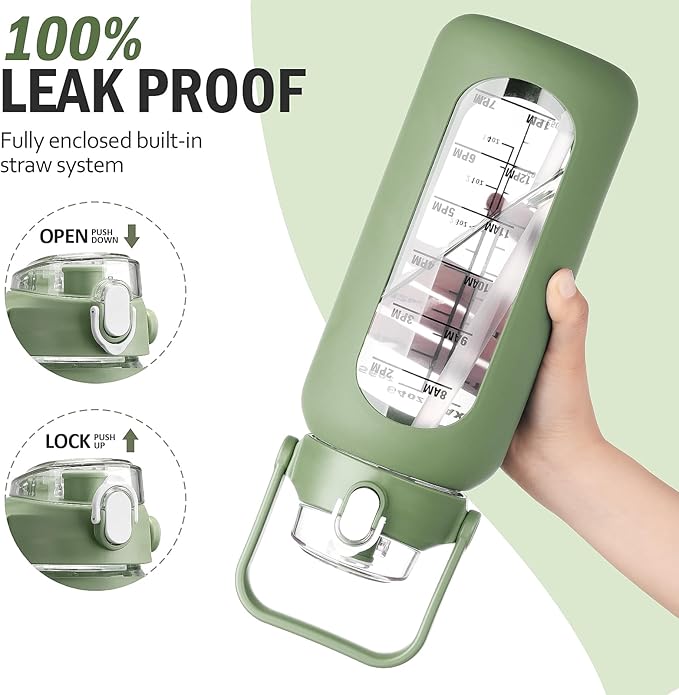 • TIME MARKERS - Our water bottle with time marker 64 oz features time reminders for effortless daily hydration tracking. The clear markings on the glass ensure easy readability and mastery of your water intake goals.