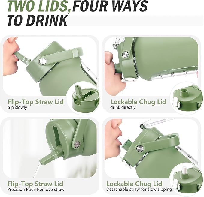 • FLEXIBLE DUAL LID DESIGN - This water bottle features two unique lids: a flip-top straw lid for slow sipping and a lockable chug lid for quick hydration. The built-in straw system is fully enclosed, making it practical and leak-proof for your beverage safety.