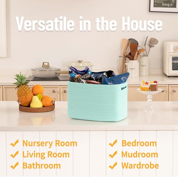 • Elegant: SIXDOVE Cotton Rope Storage Basket. The woven design of these baskets adds a touch of rustic charm to any room decor, making them a perfect addition to your living room, bedroom, or nursery. SIXDOVE rope shelf basket looks good in your shelves, closet or next to your bed and is an essential item for your daily storage. This cube rope storage basket enhances any room or décor at your home